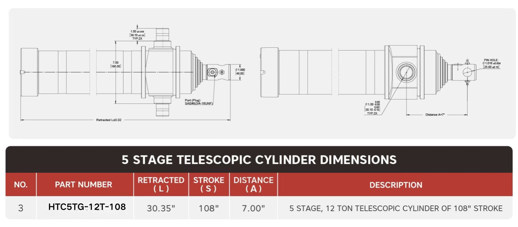 "HTC5TG-12T-108", 5 स्टेज, 12 टन ऑफ 108" स्ट्रोक टेलिस्कोपिक सिलेंडर