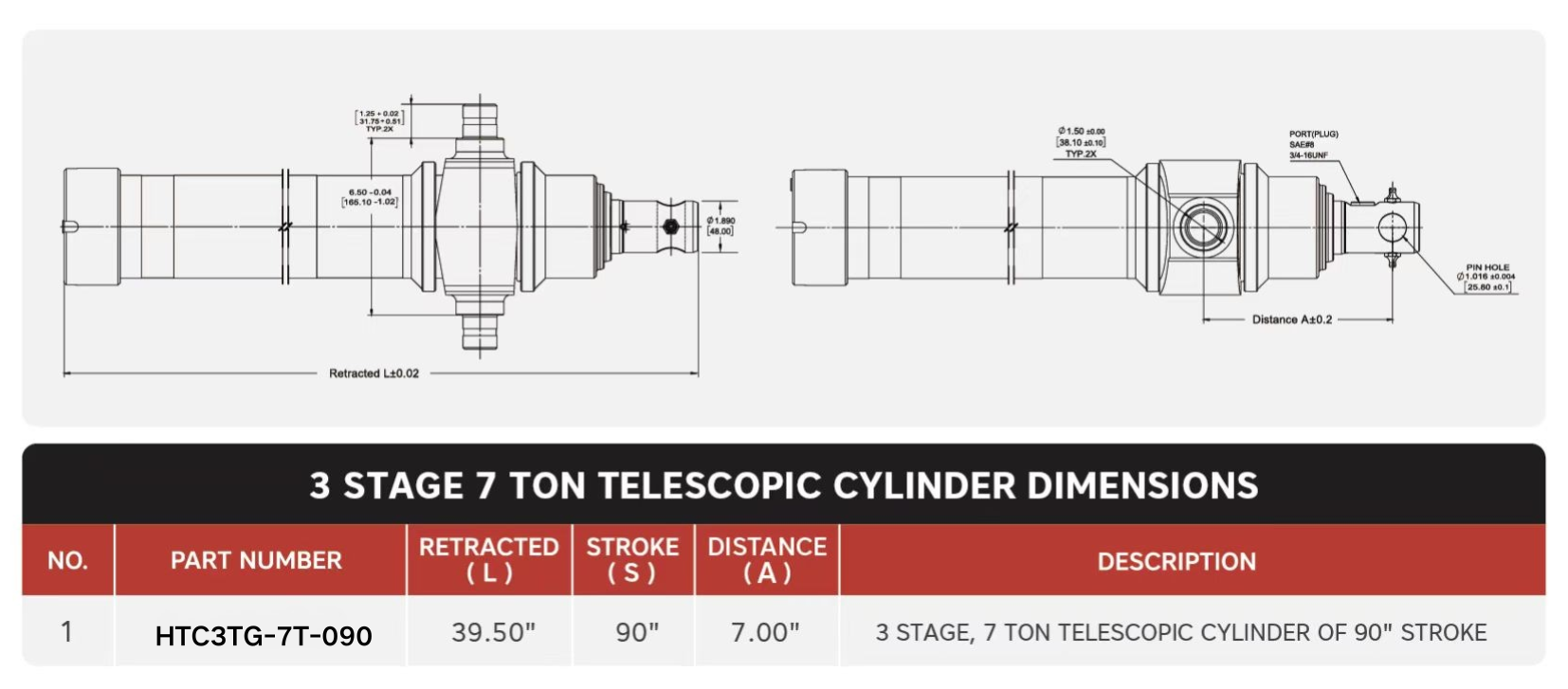 "HTC3TG-7T-090", 3 स्टेज, 90 पैकी 7 टन स्ट्रोक टेलिस्कोपिक सिलेंडर