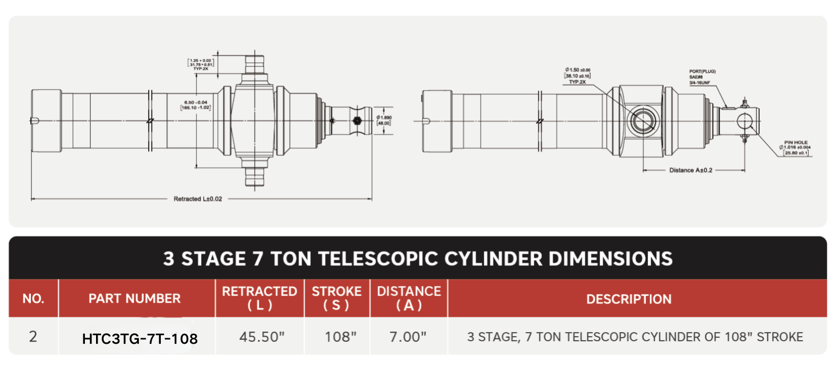 "HTC3TG-7T-108", 3 स्टेज, 7 टन 108" स्ट्रोक टेलिस्कोपिक सिलेंडर