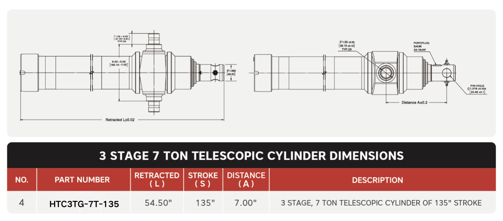 "HTC3TG-7T-135", 3 स्टेज, 135 पैकी 7 टन स्ट्रोक टेलिस्कोपिक सिलेंडर